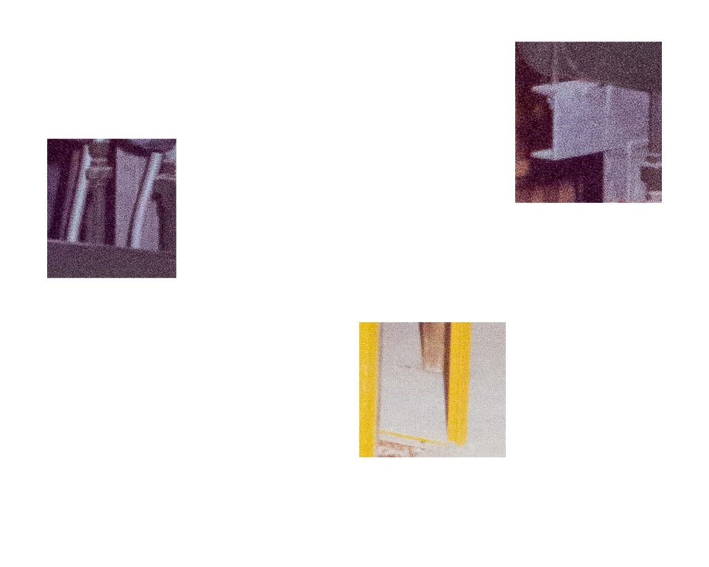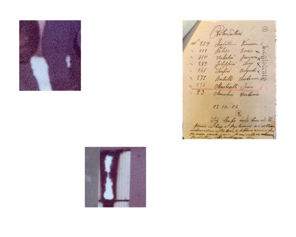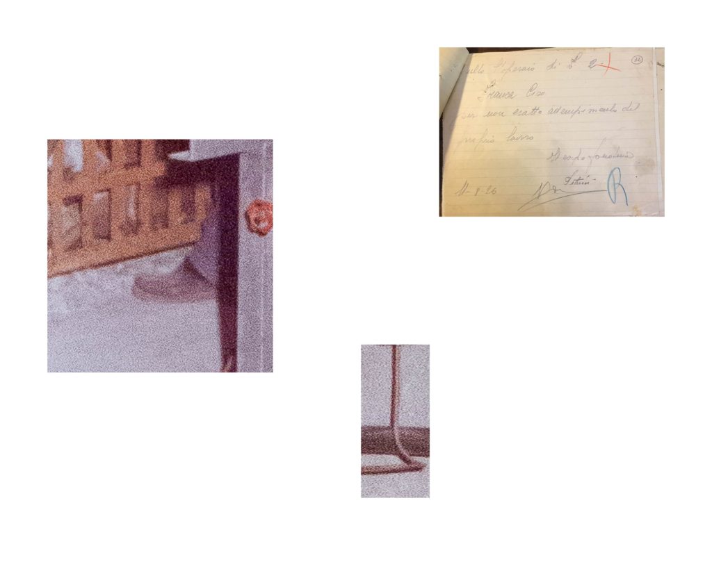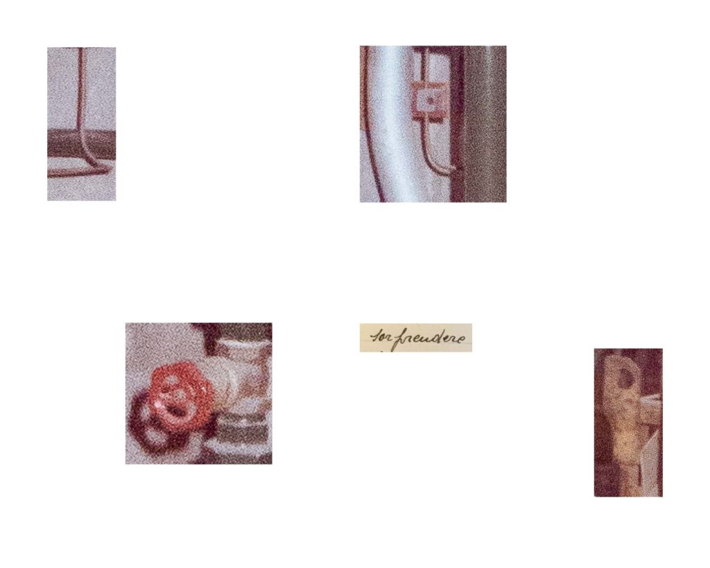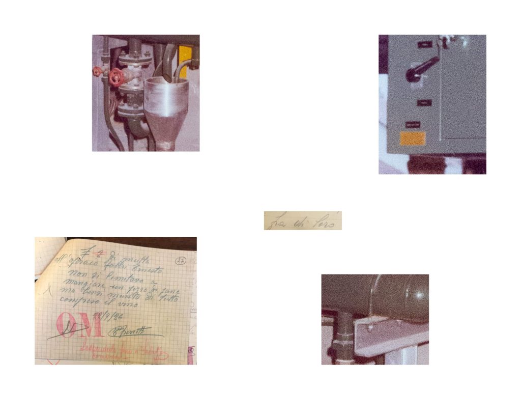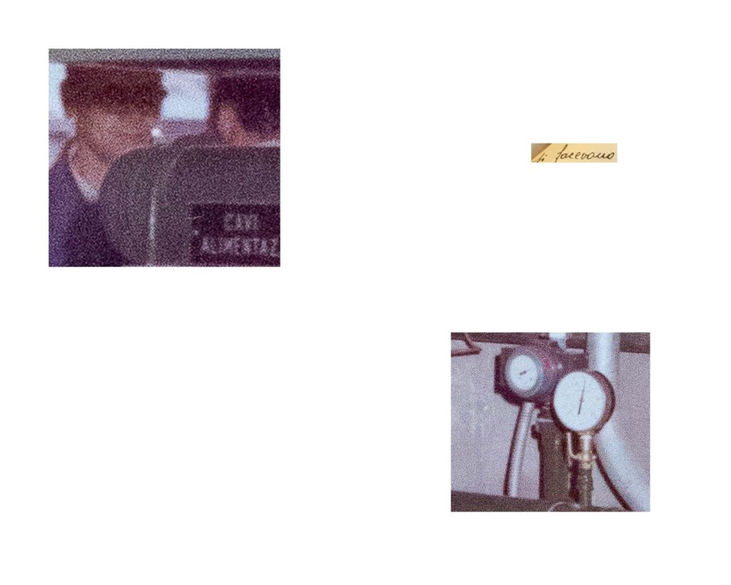 Mattia Fabbri in Si facevano sorprendere fra di loro a conversare, dopo avere osservato schemi e stereotipi compositivi delle fotografie che riprendono operai al lavoro, sceglie quella dove maggiore è l’immobilità dei gesti. Scompone l’immagine in frammenti quasi volesse compiere un viaggio all’interno della fotografia d’archivio, e accostando questi elementi visuali a frammenti testuali ricavati dalle note disciplinari compone una nuova visione, i suoi frammenti ci portano ad osservare particolari nascosti che conducono la visione ad una particolare attenzione. Mattia indaga, in questa ricerca, anche la potenzialità evocativa del medium; un viaggio dentro il mondo e i volti del lavoro, che certo tiene conto del viaggio dentro le mura di Modena che Franco Vaccari compie nel 1970 stampando e ingrandendo una lastra dello Studio Orlandini, o del Viaggio in Italia di Joachim Schmid che frammenta fotografie souvenir.